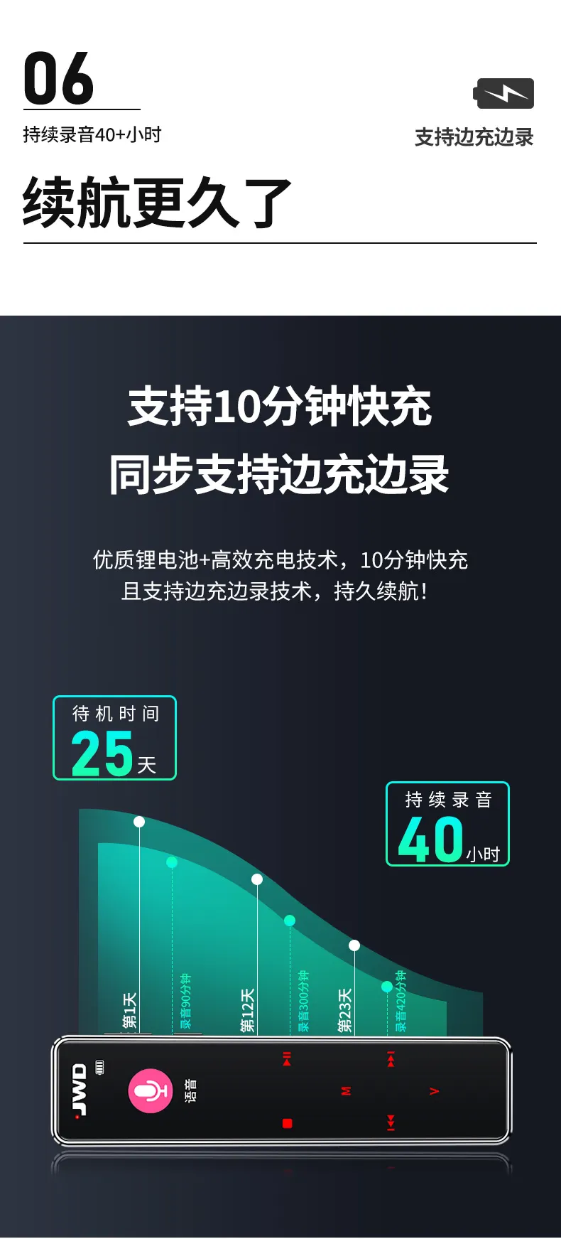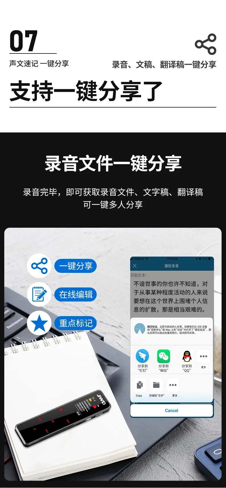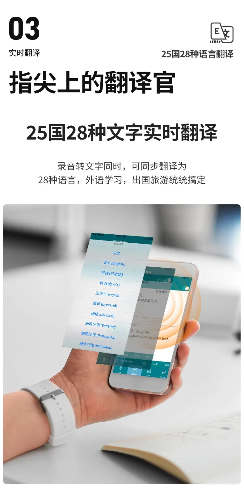 高清原聲音質(zhì),AI降噪體驗(yàn),拾音速記轉(zhuǎn)寫(xiě),25國(guó)同聲轉(zhuǎn)譯,支持邊充邊錄