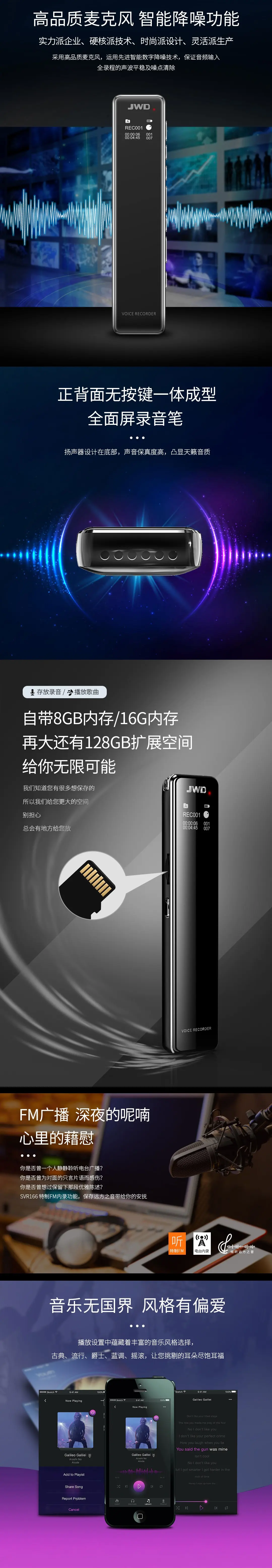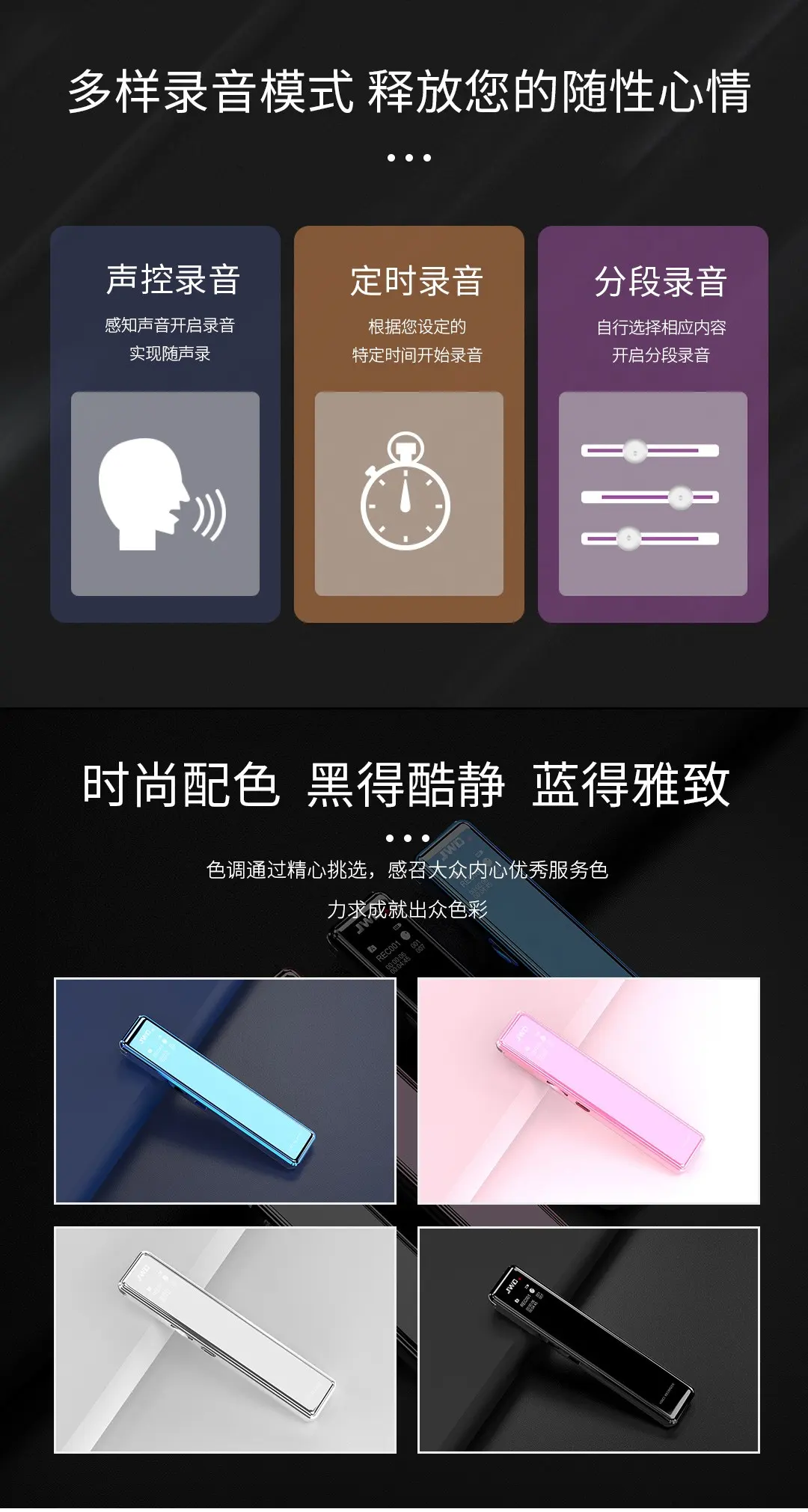 全金屬機體,智能數(shù)字化降噪輸入,聲控/定時/分段多樣錄音,四配色可選