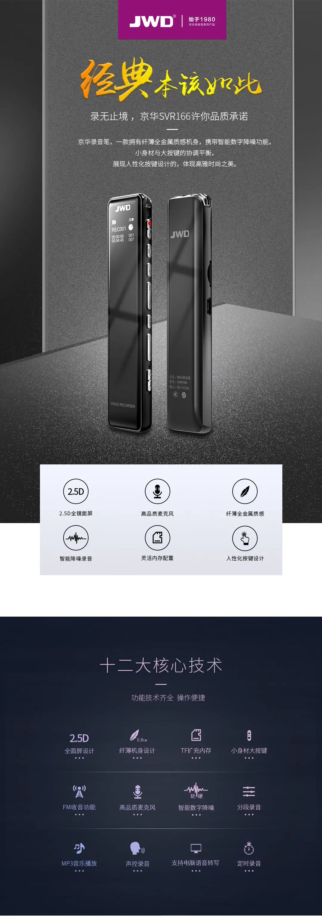 2.5D全鏡面顯屏,高品質(zhì)麥克風(fēng),支持TF卡取換,人性化按鍵設(shè)計,智能數(shù)字降噪