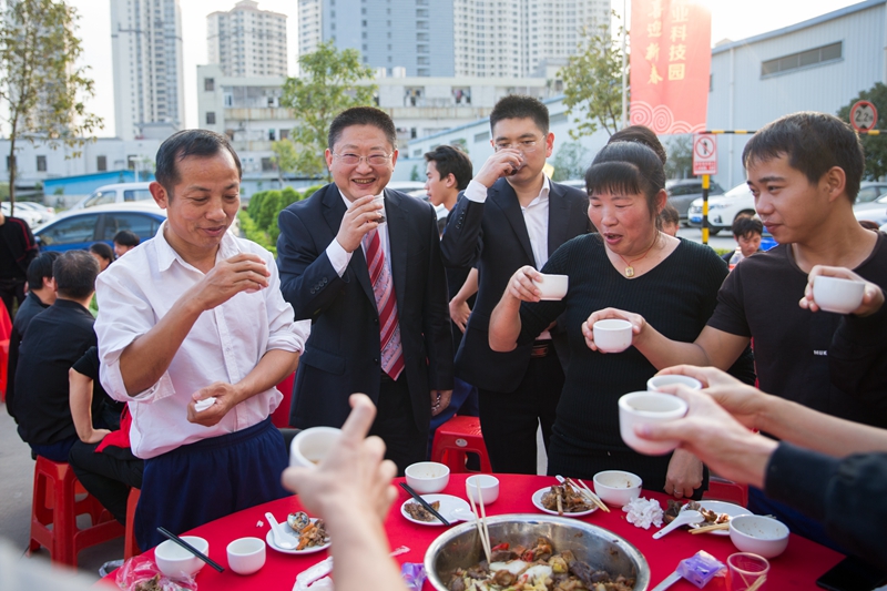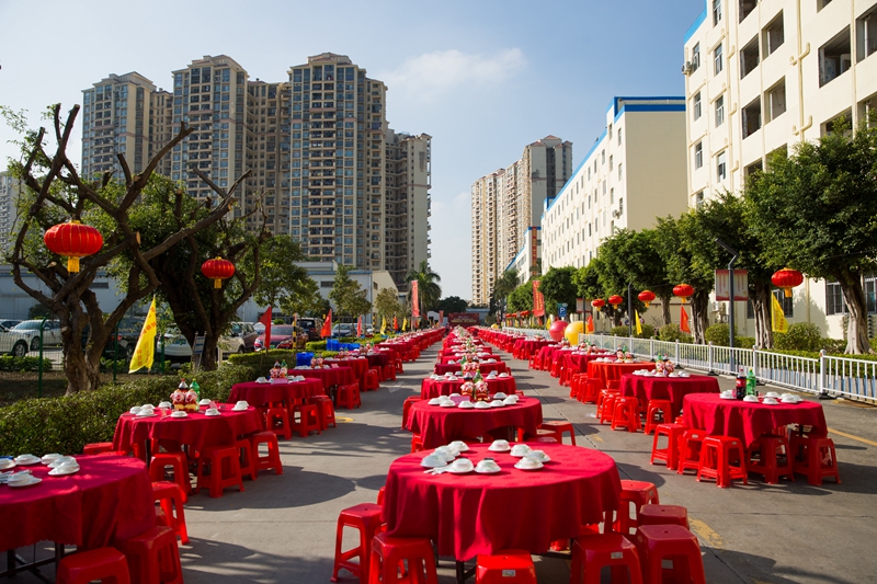 2019年1月11日下午,鳥語花香、陽光明媚。京華智能產(chǎn)業(yè)科枝園區(qū)彩旗獵獵,燈籠高掛,處處張燈結(jié)彩,一副熱鬧非凡、美輪美奐的景象。遠遠望去,京華大道上綿延幾百米,整齊地排列著160張鋪著大紅臺布的餐桌,猶如幾條巨大無比的彩帶在京華科技園區(qū)飛舞,場面頗為壯觀。