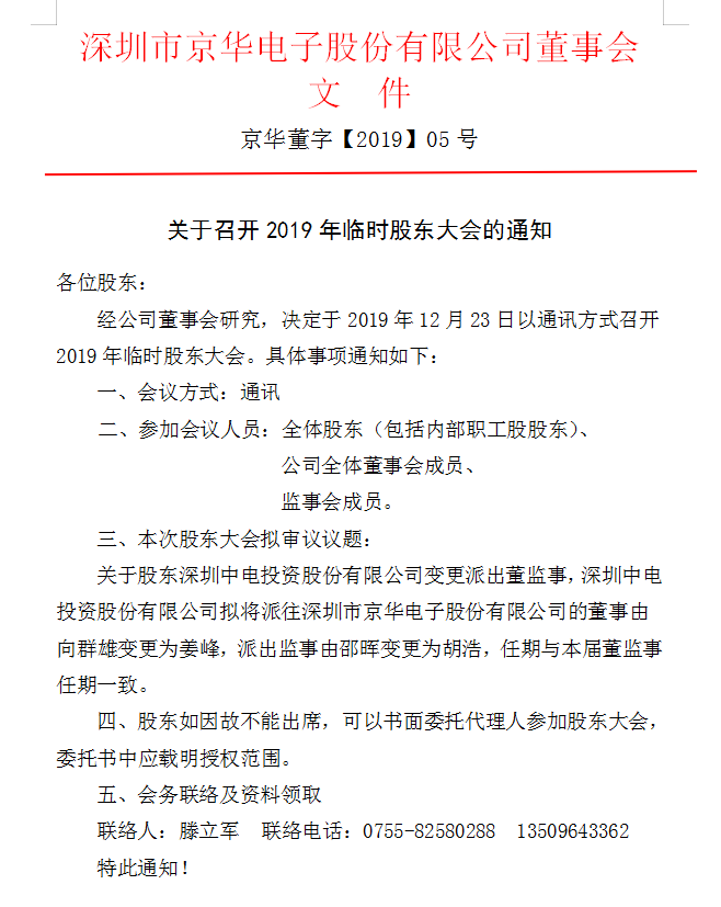 深圳市京華電子股份有限公司關(guān)于召開2019年度股東大會的通知