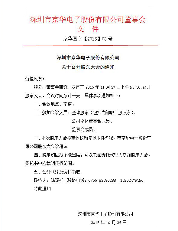 深圳市京華電子股份有限公司關(guān)于召開股東大會的通知
