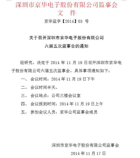 關(guān)于召開深圳市京華電子股份有限公司六屆五次監(jiān)事會的通知