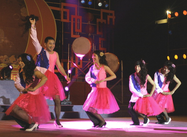 整臺晚會最風趣幽默當屬京華數(shù)碼李華、邵天愚表演的相聲《兄弟》和京華尼歐事業(yè)部的反串舞蹈《五朵金花》。《兄弟》取材于職工當中,以幽默詼諧、喜聞樂見的相聲形式再現(xiàn)了大家的生產(chǎn)生活和感情世界。耳熟能詳?shù)拿帧⑺圃嘧R的經(jīng)歷、引人捧腹的臺詞,引得臺下觀眾陣陣掌聲和笑聲,觀眾們都感嘆到:沒想到我們的日常生活搬到舞臺上竟然這么有意思!隨著串燒音樂的響起,尼歐事業(yè)部的“五朵金花”向舞臺款款走來,還沒開始表演,他們的造型就已經(jīng)逗得臺下觀眾捧腹大笑。四男一女5名演員身體左邊從發(fā)型、頭飾、妝容、衣服、鞋襪都為男妝,而右邊卻都為女妝,這種扮相乍一看的確雷人。尤其是看慣了一段柔媚嬌艷的女子舞蹈,突然一個轉(zhuǎn)身即為雄糾糾氣昂昂的男人舞蹈,一時還真是難以適應(yīng),但這正是節(jié)目的精華所在。